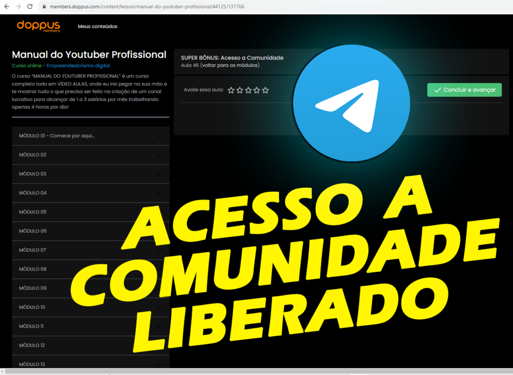 Você vai ter acesso a comunidade de alunos, nela você irá interagir com outros alunos, tirar dúvidas com os próprios alunos, saber das tendências do momento, atualizações recentes e acompanhar o progresso de alunos que assim como você, querem realizar o sonho de viver de Youtube.
